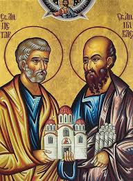 Свети апостол Петар – Син Јонин, брат Андреје првозваног, из племена Симеонова, из града Витсаиде. Био је рибар, и најпре се звао Симеоном, но Господ је благозволео назвати га Кифом, или Петром (Јн 1, 42). Он је први од ученика јасно изразио веру у Господа Исуса рекавши: “Ти су Христос, Син Бога живога” (Мт 16, 16). Његова љубав према Господу била је велика, а његова вера у Господа постепено се утврђивала. Када је Господ изведен на суд, Петар Га се три пута одрекао, но само један поглед у лице Господа – и душа Петрова била је испуњена стидом и покајањем. После силаска Светога Духа Петар се јавља наустрашивим и силним проповедником Јеванђеља. После његове једне беседе у Јерусалиму обратило се у веру око три хиљаде душа. Проповедао је Јеванђеље по Палестини и Малој Азији, по Илирику и Италији.Чинио је моћна чудеса: лечио је болесне, ваксрсавао мртве; чак и од сенке његове исцељивали су се болесници. Имао је велику борбу са Симоном Волхом, који се издавао за бога, а у ствари био је слуга сатанин. Најзад га је посрамио и победио. По заповести опакога цара Нерона, Симоновог пријатеља, Петар би осуђен на смрт. Поставивши Лина за епископа у Риму и посаветовавши и утешивши стадо Христово, Петар пође радосно на смрт. Видећи крст пред собом, он умоли своје џелате, да га распну наопако, пошто сматраше себе недостојним да умре као и Господ његов. И тако упокоји се велики слуга великог Господара, и прими венац славе вечне. Свети апостол Павле – Родом из Тарса, а од племена Венијаминова. Најпре се звао Савле, учио се код Гамалила, био фарисеј и гонитељ Хришћанства. Чудесно обраћену веру хришћанску самим Господом, који му се јавио на путу за Дамаск. Крштен од апостола Ананије, прозват Павлом и увршћен у службу великих апостола. Са пламеном ревношћу проповедао Јеванђеље свуда од граница Арабије до Шпаније, међу Јеврејима и међу незнабошцима. Добио назив апостола незнабожаца. Колико су страховита била његова страдања, толико је било његово натчовечанско стрпљење. Кроз све године свог проповедања он је из дана у дан висио као о једном слабом кончићу између живота и смрти. Пошто је испунио све дане и ноћи трудом истрадањем за Христа, пошто је организовао цркву по многобројним местима, и пошто је достигао ту меру савршенства, да је могао рећи: “Не живим ја него Христос живи у мени”, тада је био посечен у Риму, у време цара Нерона, кад и апостол Петар. Тропар, глас 4. Апостола Првопрестолници, и Васељене Учитељи, Владику свих молите: да дарује мир Васељени, и душама нашим велику милост. +++ Неуки и уки, но духом једнаки И љубављу Божјом ко ангели јаки, Петар прости човек, Павле школовани – Благодаћу Духа оба обасјани. Две пламене свеће, свеће неугасне, Две блиставе звезде, високе и красне. Обиграше земљу, и светлост пронеше Све људима даше, ништа не узеше, Сиромаси пуки – свет обогатише, Узници и слуге – сав свет покорише. Свет обогатише учењем Христовим, Сав свет покорише оружијем новим: Смирењем и миром, и благом кротошћу. Молитвом и постом и силном милошћу. Кад им бурног дана стиже бурно вече Нерон крвожедни живот им пресече. Но кад владар света заповест издаде И Петра и Павла страдању предаде. Свет бејаше њихов, a не његов више – Апостоли смрћу царство задобише.