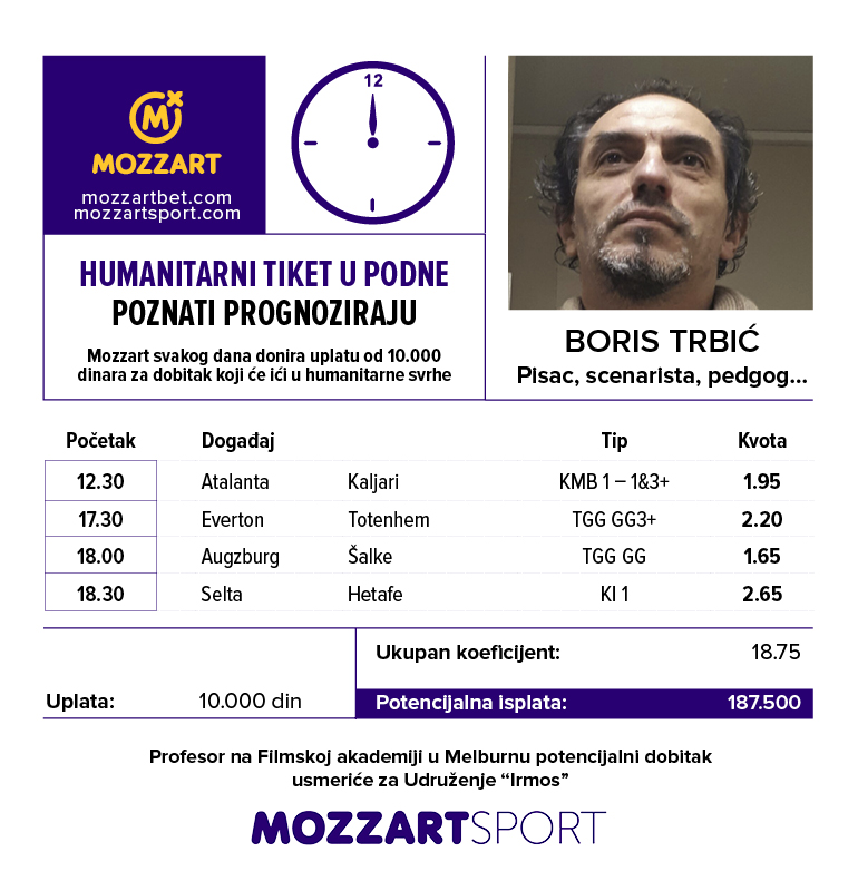 1242. Humanitarni tiket u podne: Boris Trbić tipuje za Udruženje “Irmos”