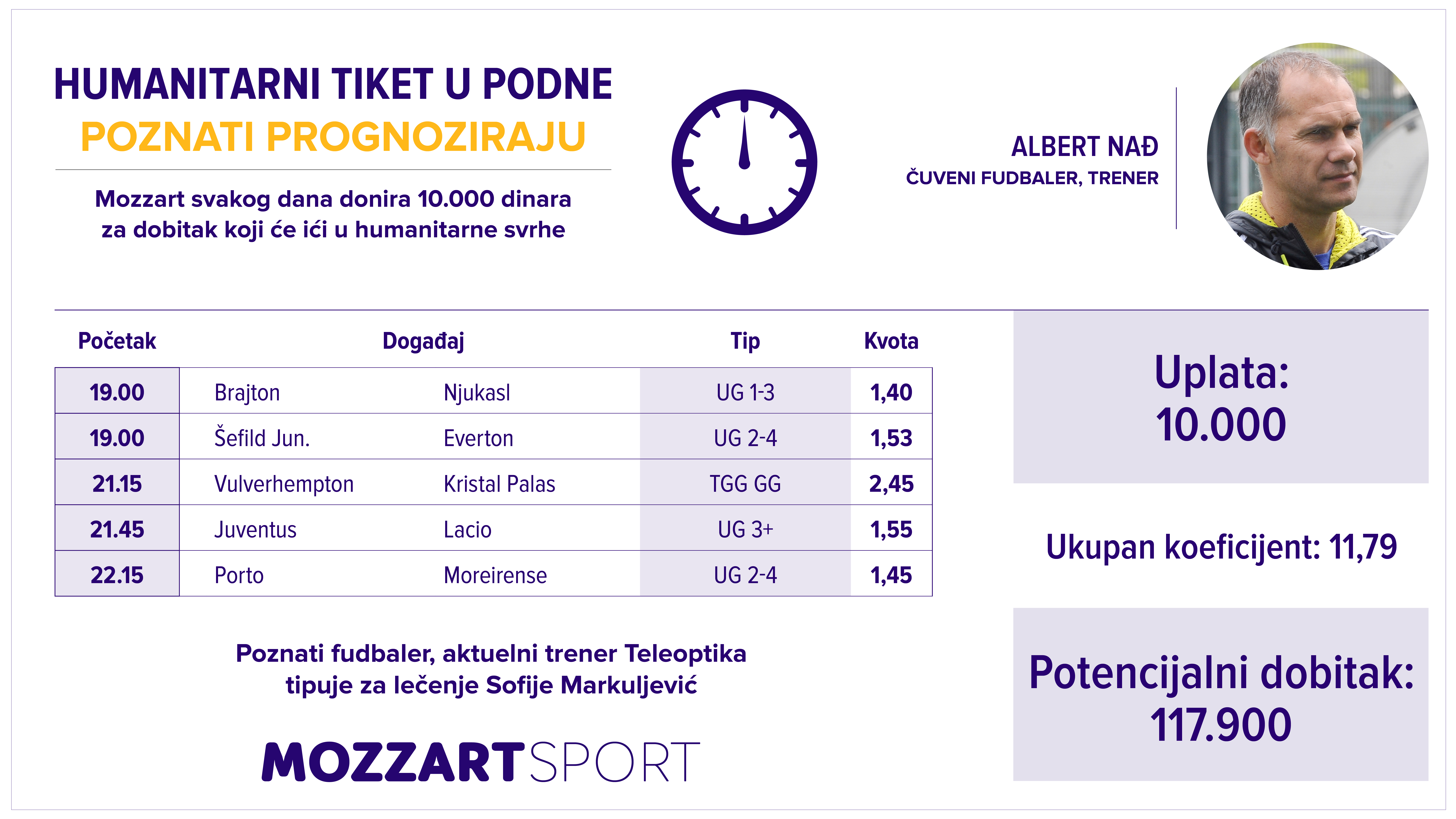 Sigurnim koracima kompanija MOZZART, portal Mozzart Sport i “Humanitarni tiket u podne” juče su stigli do 1500. plemenitog listića. Dan posle, naš dobrotvorni kladilac je sjajni fudbaler Partizana, sada trener Teleoptika, Albert Nađ. Nekadašnji prvotimac španskih klubova Betisa, Ovijeda i Elčea kao i svi dosadašnji poznati učesnici, na raspolaganju ima 10.000, 00 dinara za sastavljanje humanitarnog tiketa. Ukoliko “prođu” sve igre na tiketu plemeniti dobitak naša kompanija doniraće za lečenje devojčice Sofije Markuljević. MOZZART je već uplatio 140.500,00 dinara za Sofijino lečenje jer je dobrotvorni listić Igora Gluščevića bio dobitan.