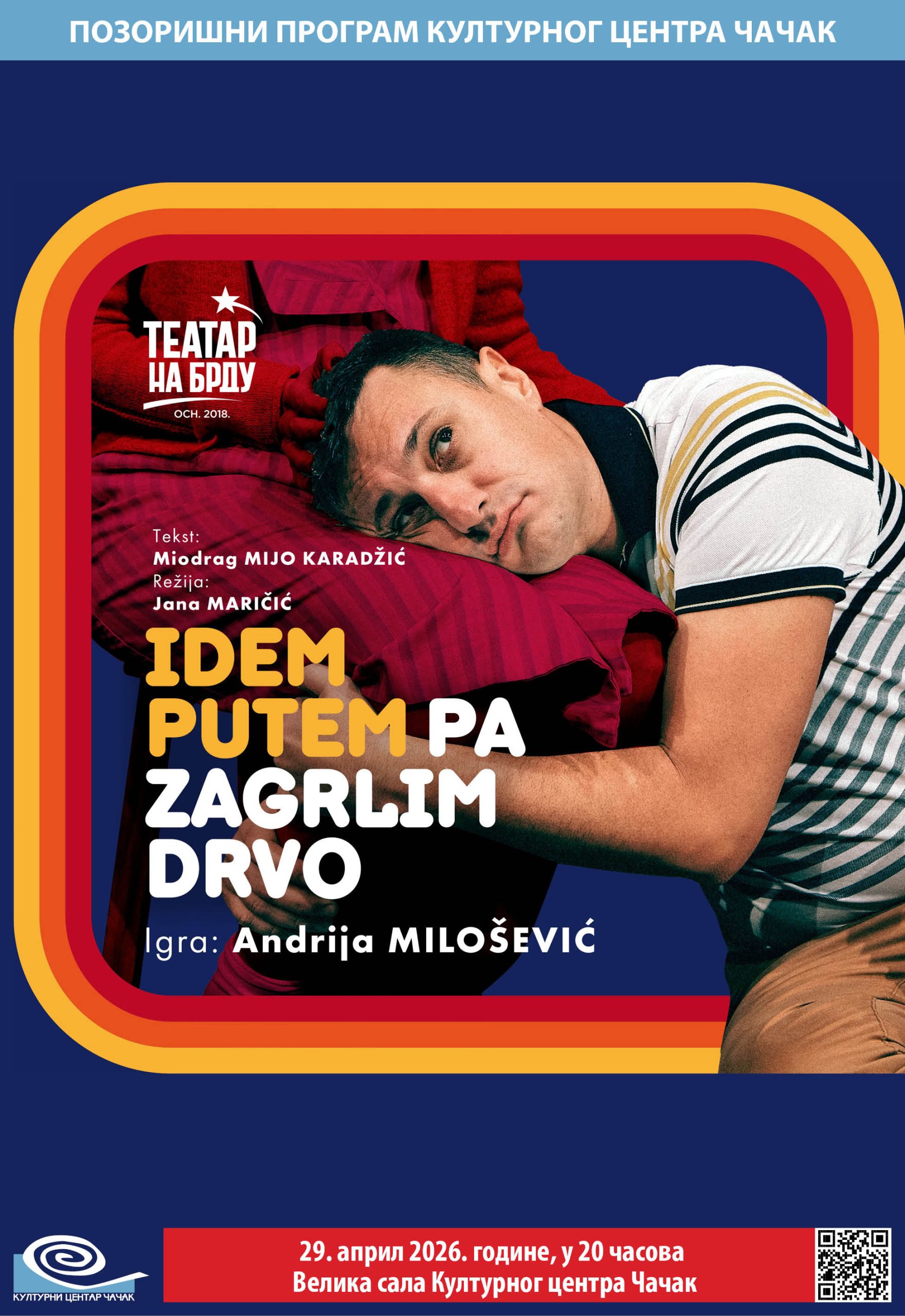 Текст представе „Идем путем па загрлим дрво“ написао је Миодраг Караџић а представа је премијерно изведена 2019. године у Театру на Брду. Андрија Милошевић у урнебесно комичној причи о једном сину ком мама тражи праву жену. Кандидаткиње се смењују, а он и мама доживљавају невероватна искуства. Међутим, када на врата закуца она „права“ наш јунак ће упознати судбину у свој њеној раскоши.