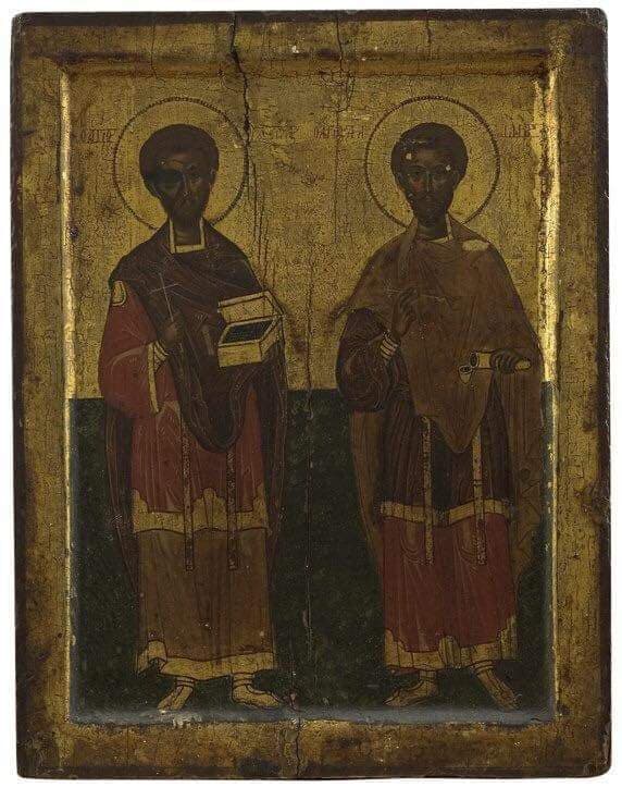 На фотографији хиландарска икона Св. Бесребреника Козме и Дамјана
