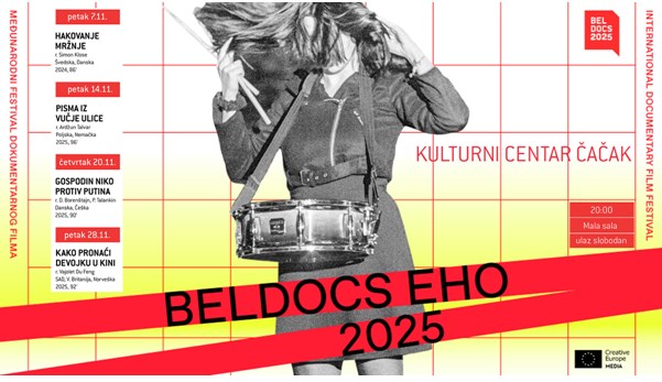Turneja Međunarodnog festivala dokumentarnog filma Beldocs pod nazivom BELDOCS EHO izgrađuje i edukuje publiku širom Srbije još od 2011. godine kvalitetnim i atraktivnim programom. Deo zvanične selekcije 18. izdanja Beldocsa (21-27. maj 2025.) prikazuje se u više od dvadeset mesta u Srbiji. Ovog novembra, i u КC Čačak, četiri sjajna dokumentarca nagrađena na prestižnim svetskim filmskim festivalima! Ulaz slobodan.