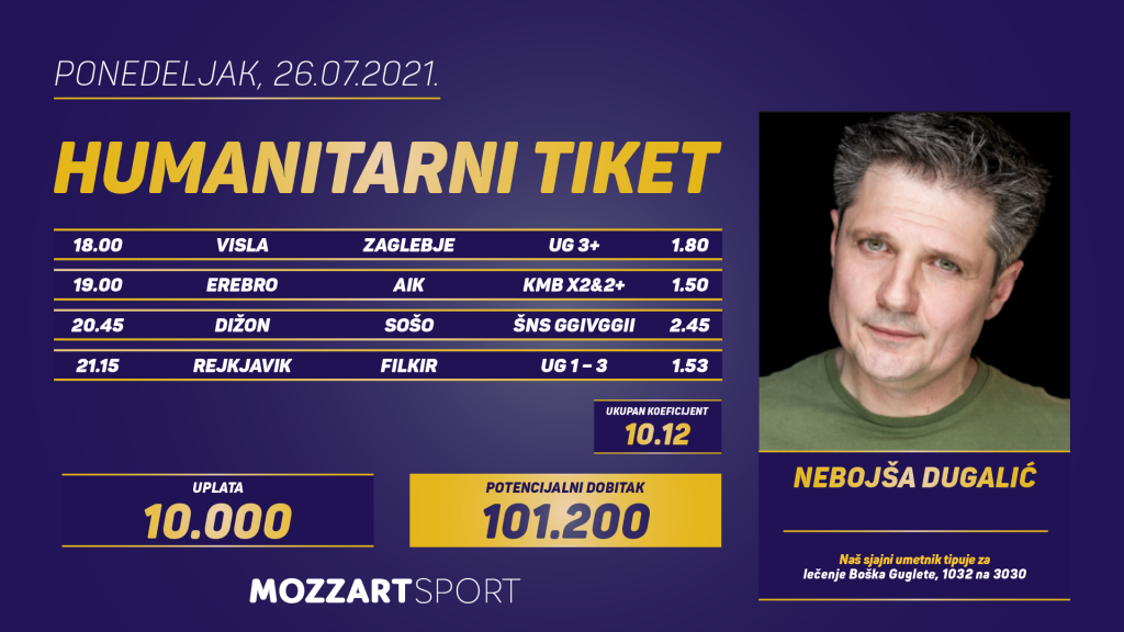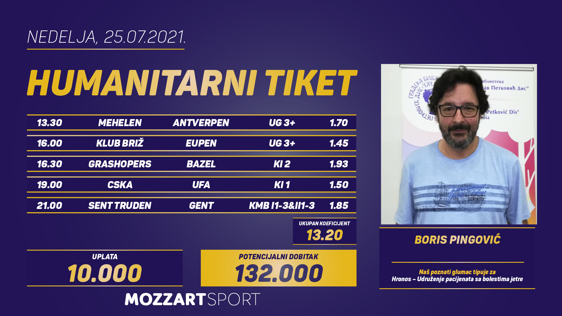 MOZZARTOV jučerašnji učesnik u Humanitarnom tiketu u podne bio je maksimalno uspešan. Naš poznati glumac sastavio je dobrotvorni listić sa dobitkom od 132.000 dinara. Boris Pingović nastavio je Mozzartov pozitivan niz. “Uhvatio” je tri plus na utakmicama MEHELEN – ANTVERPEN odnosno KLUB BRIŽ – EUPEN. Potom, dvojku na GRASHOPERS – BAZEL, jedinicu na CSKA – UFA i na kraju kombinaciju I1-3&II1-3 na duelu SENT TRUDEN – GENT za konačni prolaz tiketa.