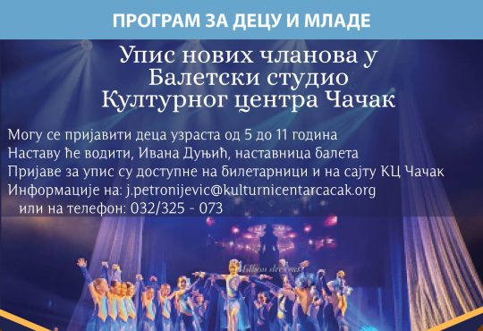 OstaloUPIS U BALETSKI STUDIO KULTURNOG CENTRA ČAČAK (2025/2026. godina)Djurdjeseptembar 1, 2025septembar 1, 2025136U toku je prijavljivanje za upis u Baletski studio Kulturnog centra Čačak koje će trajati do 10. septembra 2025. godine....