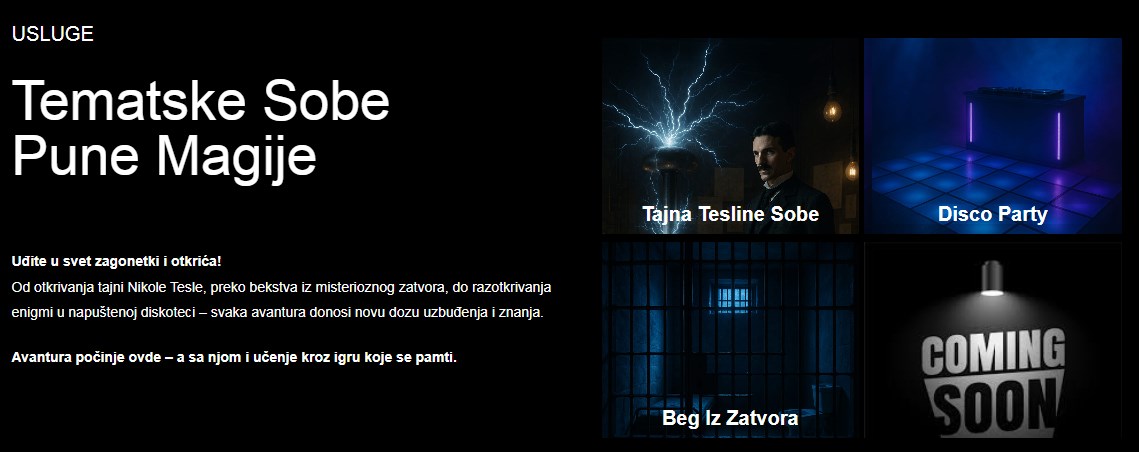 – **Tematske sobe:** Tesla, Zatvor i Diskoteka pružaju različita iskustva i podstiču kreativno razmišljanje.