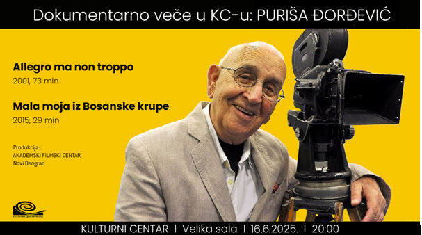 Novo „Dokumentarno veče u KC-u“, ali stari znanac: Puriša Đorđević. Na programu su dokumentarni filmovi slavnog reditelja koje je realizovao u okviru Akademskog filmskog centra u Novom Beogradu, „Allegro m’a non troppo“ (2001) i „Mala moja iz Bosanske Krupe“ (2015). Film istog naziva kao i Purišin dokumentarac iz 1985, „Allegro ma non troppo“, Purišin je autobiografski found-footage esej, kolaž snimaka sa televizije, tokom emitovanja dokumentaraca o poznatim filmskim autorima koji su uticali na Purišu, intervjua koje je davao televizijama, odlomaka iz filmova. Purišin poslednji dokumentarac, „Mala moja iz Bosanske krupe“, koji u celosti sadrži i njegov prvi dokumentarni film „Grob u žitu“ (1951), predstavlja omaž Branku Ćopiću, piscu po čijim pričama je snimio četiri kratka filma.
