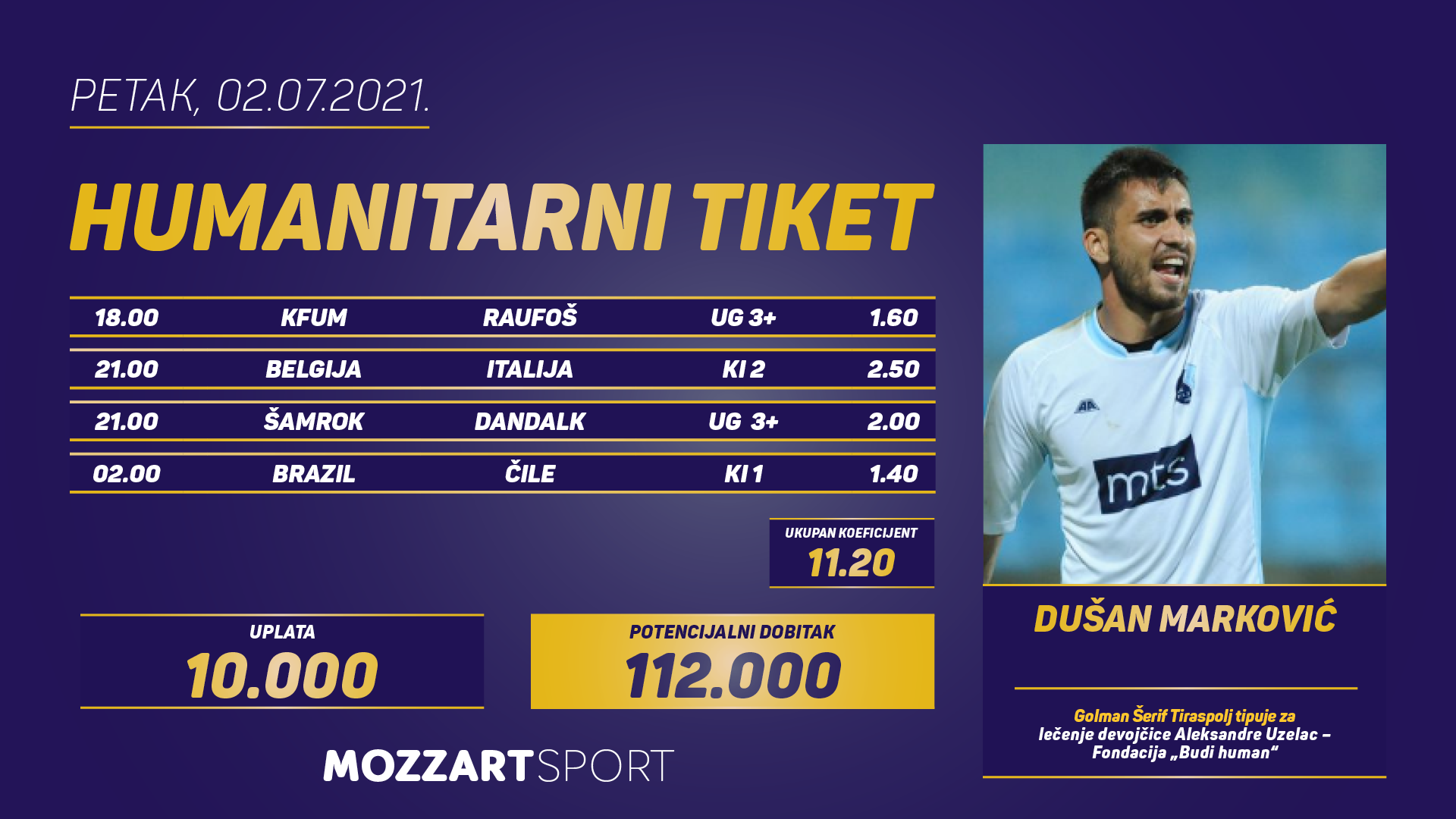 MOZZARTOV jučerašnji učesnik u Humanitarnom tiketu u podne bio je do kraja uspešan, tačnije do jutarnjih sati. Golman Šerifa sastavio je dobrotvorni listić sa dobitkom od 112.000 dinara. Dušan Marković nastavio je naš pozitivan niz. “Uhvatio” je jedinice na duelu BRAZIL – ČILE, dvojku na meču BELGIJA – ITALIJA i tri plus na KFUM – RAUFOŠ odnosno ŠAMROK – DANDALK .