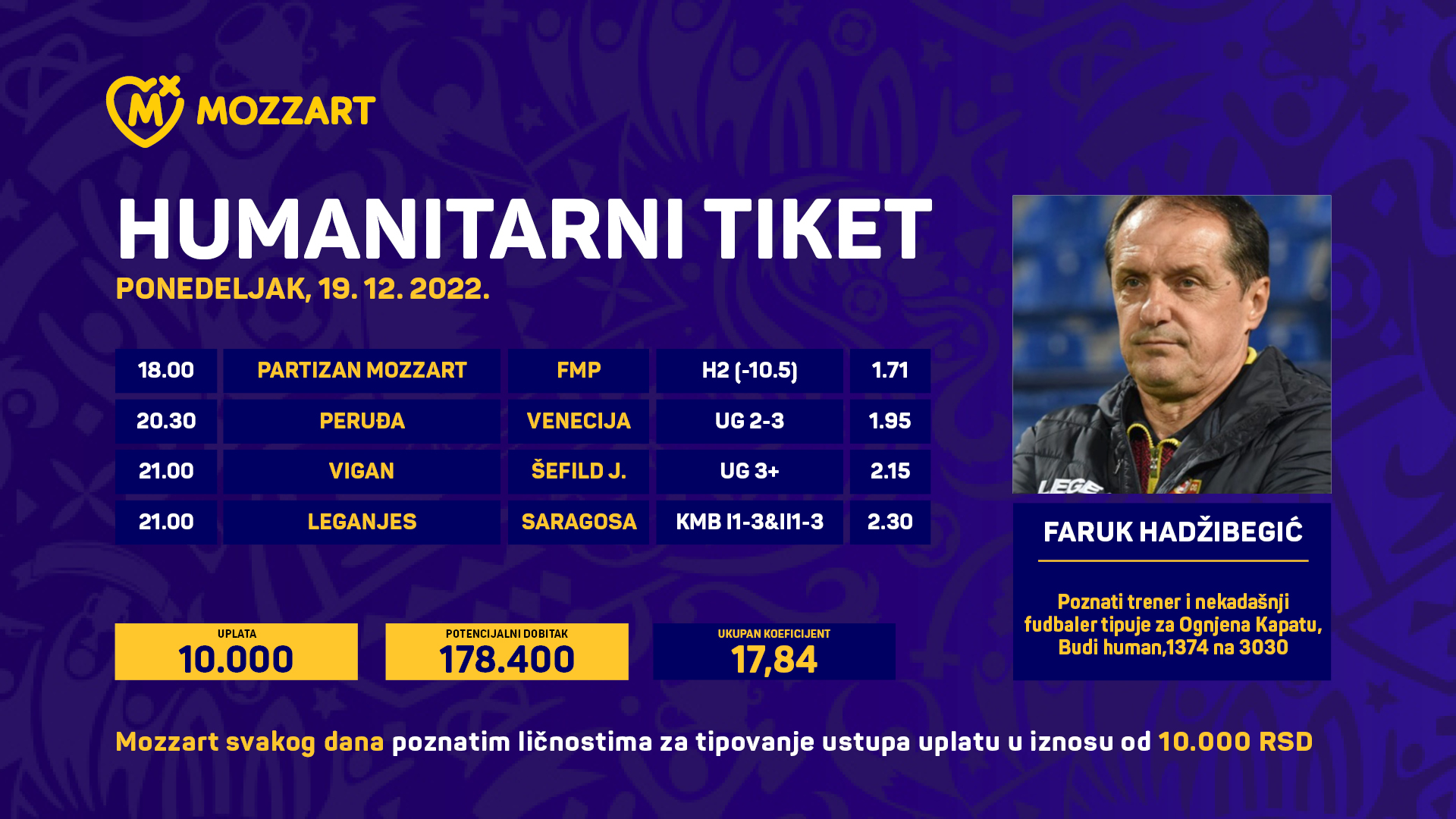 Nakon što su postali dobitni Mozzartovi dobrotvorni listići glumca Marka Gvera, strelca Damira Mikeca, muzičara Inspektora Blaže, košarkaša Nikole Kalinića, fudbalera Lazara Markovića, 3×3 šampiona Marka Brankovića, predsednika OSS Zorana Gajića, poznate voditeljke Nataše Miljković, novinarke Duške Jovanić i trener Faruk Hadžibegić je postao pobednik. U Mozzartovom humanitarnom nizu 369. po redu. Poznati trener i selektor pogodio je tipove na četiri fudbalske utakmice za odličnu sumu od 178.400 dinara koje je usmerio za Ognjena Kapatu, 1374 na 3030.