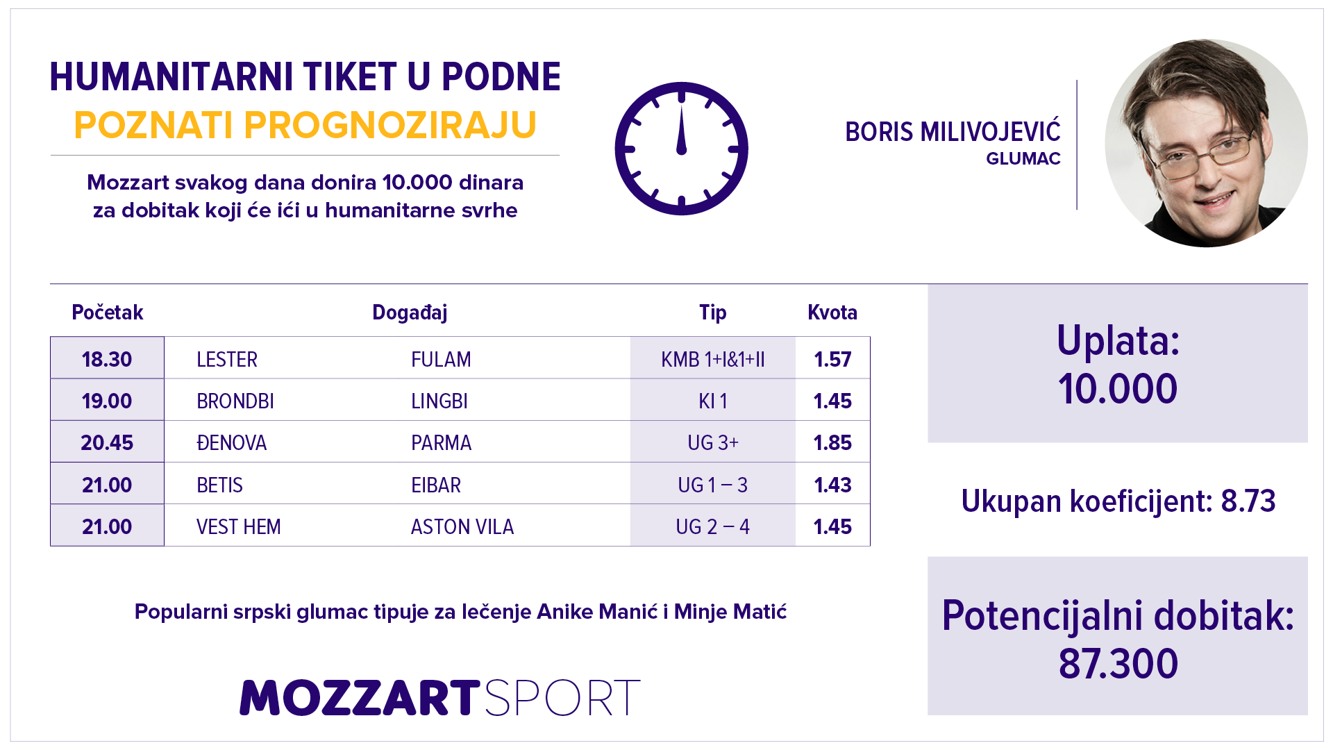 Podsećamo na MOZZART – ove plemenite kladioce u “Humanitarnom tiketu u podne” sa iznosima od preko 100.000, 00 dinara.To su: Andrea Trinkijeri, Ivan Jović, Strahinja Gavrilović, Vanja Bulić, Momčilo Bajagić, Uroš Tripković, Radomir Antić, Vojin Ćetković, Vojkan Borisavljević, Zdravko Čolić, Jovan Maljoković, Nenad Stojmenović, Sara Sakradžija, Milan Caci Mihailović, Miloš Teodosić, Danica Ristovski, Dimitrije Ilić, Marko Tejić, Srđan Vasiljević, Milica Mandić, Branislav Trifunović, Predrag Miljuš, Dragana Cvijić, Boris Režak, Duško Pijetlović, Prof. Branko Đurović, Duško Nikolić, Zoran Vujičić, Milan Pavkov, Ana Joković, Ivica Šurjak, Emir Kusturica, Aleksandar Srećković, Nikola Mišković, Dejan Mišković, Zoran Višić, Ljubiša Stojanović, Milan Mačvan, Nenad Brnović, Ivan Paunić, Dejan Ristić, Milena Pavlović Čučilović, Antun Novaković, Pero Antić, Ivan Ivković, Brajs Džouns, Nebojša Vučićević, Darko Tešović, Aleksandar Simetrija Đorđević, Zoran Njeguš, Milan Zelen, Predrag Jeremić, Igor Gluščević, Slavoljub Krnjinac, Mirko Milikić, Mladen Krstajić, Vanja Savić, Vladimir Lučić, Danilo Nikolić, Olja Lević i Milovan Ćirković.