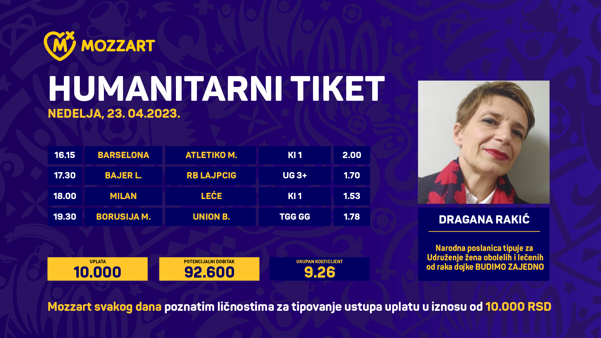 Podsećamo i na MOZZART – ove dobrotvorne kladioce u “Humanitarnom tiketu u podne” sa iznosima od preko 100.000, 00 dinara. To su: Andrea Trinkijeri, Ivan Jović, Strahinja Gavrilović, Vanja Bulić, Momčilo Bajagić, Uroš Tripković, Radomir Antić, Vojin Ćetković, Vojkan Borisavljević, Zdravko Čolić, Jovan Maljoković, Nenad Stojmenović, Sara Sakradžija, Milan Caci Mihailović, Miloš Teodosić, Danica Ristovski, Dimitrije Ilić, Marko Tejić, Srđan Vasiljević, Milica Mandić, Branislav Trifunović, Predrag Miljuš, Dragana Cvijić, Boris Režak, Duško Pijetlović, Prof. Branko Đurović, Duško Nikolić, Zoran Vujičić, Milan Pavkov, Ana Joković, Ivica Šurjak, Emir Kusturica, Aleksandar Srećković, Nikola Mišković, Dejan Mišković, Zoran Višić, Ljubiša Stojanović, Milan Mačvan, Nenad Brnović, Ivan Paunić, Dejan Ristić, Milena Pavlović Čučilović, Antun Novaković, Pero Antić, Ivan Ivković, Brajs Džouns, Nebojša Vučićević, Darko Tešović, Aleksandar Simetrija Đorđević, Zoran Njeguš, Milan Zelen, Predrag Jeremić, Igor Gluščević, Slavoljub Krnjinac, Mirko Milikić, Mladen Krstajić, Vanja Savić, Vladimir Lučić, Danilo Nikolić, Olja Lević, Milovan Ćirković, Danilo Anđušić, Moka Slavnić, Marko Baćović, Radivoje Lale Bojičić,Vladimir Jocović, Goran Bjelogrlić, Nenad Nerandžić, Bojan Todorović, Momir Rnić, Milica Zarić, Dušan Marković, Žarko Paspalj, Boris Pingović, Miloslav Samardžić, Vuk Saletović, Ivana Ilić, Nina Radovanović, Damir Mikec, Predrag Kolarević, Petar Grašo, Strahinja Rašović, Stefana Veljković, Predrag Kolarević, Đorđe Pejak, Ivana Katanić, Dušan Čeganjac, Bianka Buša, Andrija Racić, Inspektor Blaža, Maja Zmaja Stojanović, Nikola Kalinić, Milorad Popović, Vedran Borovčanin, Milan Petrović, Aleksandar Todorović, Aleksander Sekulić, Lazar Marković, Vukašin Vule Mandić, Stefan Kovačević, Zoran Gajić, Faruk Hadžibegić, Nenad J. Popović, Petar Gajić, Lenče Kukić, Zorka Gojković i Nataša Miljković.