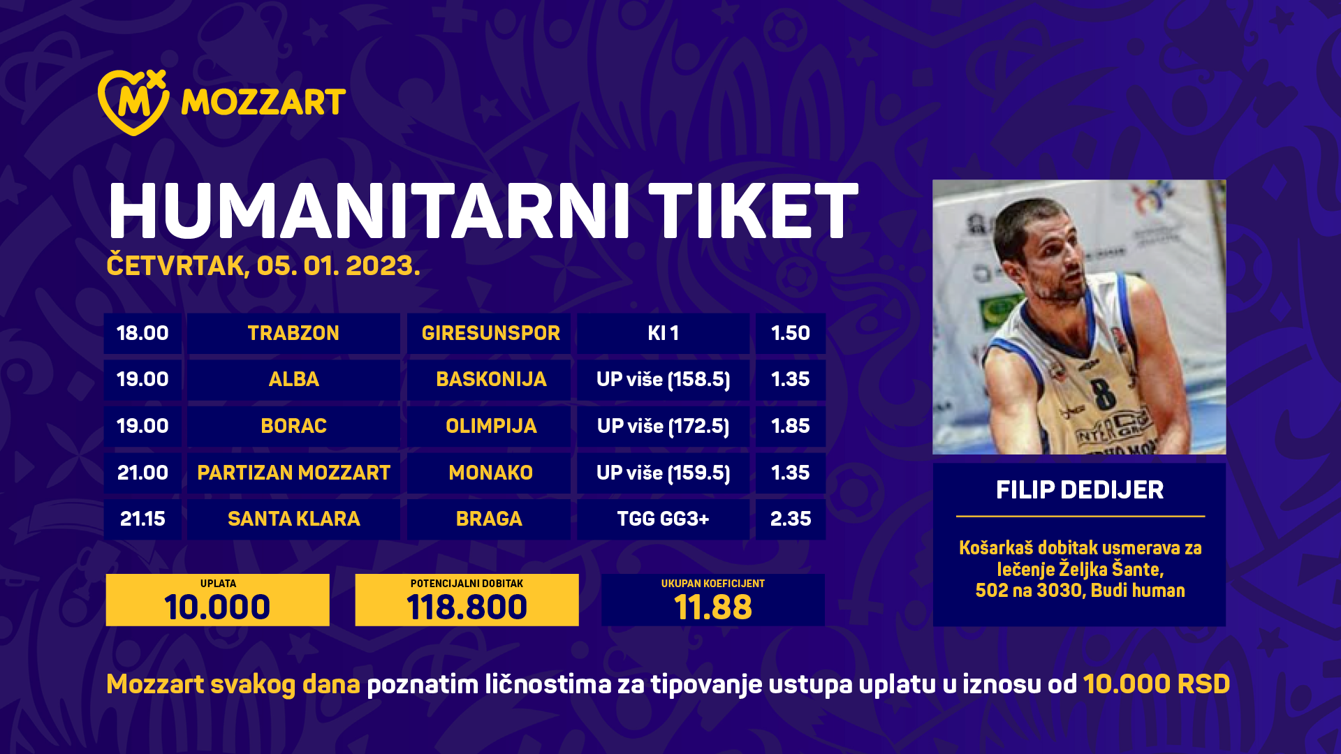 “Da, u prvom timu, ali sigurno i u mlađim kategorijama i prvoj seniorskoj sezoni u Železničaru. Naravno, kao što ste kazali i u nekoliko seniorskih sezona koje sam provedeo u Borcu. Inače, ljubav prema košarci traje pa bi svakako voleo da se bavim pozivom koji bi imao veze sa dragim sportom. Videćemo u kojoj ulozi”, kaže Filip Dedijer i startuje sa dobrotvornim tipovanjem.