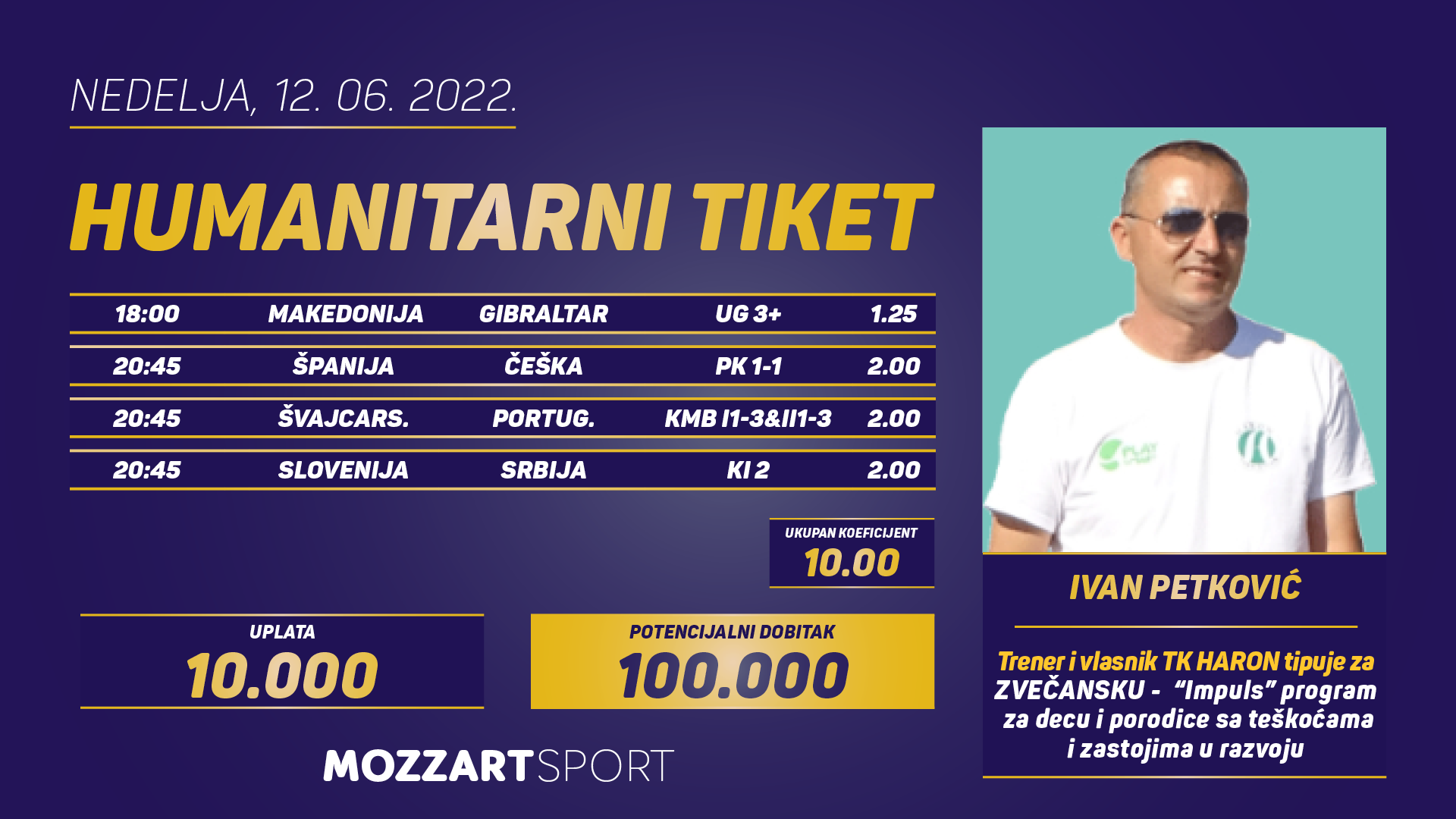 Podsećamo na MOZZART – ove dobrotvorne kladioce u “Humanitarnom tiketu u podne” sa iznosima od preko 100.000, 00 dinara. To su: Andrea Trinkijeri, Ivan Jović, Strahinja Gavrilović, Vanja Bulić, Momčilo Bajagić, Uroš Tripković, Radomir Antić, Vojin Ćetković, Vojkan Borisavljević, Zdravko Čolić, Jovan Maljoković, Nenad Stojmenović, Sara Sakradžija, Milan Caci Mihailović, Miloš Teodosić, Danica Ristovski, Dimitrije Ilić, Marko Tejić, Srđan Vasiljević, Milica Mandić, Branislav Trifunović, Predrag Miljuš, Dragana Cvijić, Boris Režak, Duško Pijetlović, Prof. Branko Đurović, Duško Nikolić, Zoran Vujičić, Milan Pavkov, Ana Joković, Ivica Šurjak, Emir Kusturica, Aleksandar Srećković, Nikola Mišković, Dejan Mišković, Zoran Višić, Ljubiša Stojanović, Milan Mačvan, Nenad Brnović, Ivan Paunić, Dejan Ristić, Milena Pavlović Čučilović, Antun Novaković, Pero Antić, Ivan Ivković, Brajs Džouns, Nebojša Vučićević, Darko Tešović, Aleksandar Simetrija Đorđević, Zoran Njeguš, Milan Zelen, Predrag Jeremić, Igor Gluščević, Slavoljub Krnjinac, Mirko Milikić, Mladen Krstajić, Vanja Savić, Vladimir Lučić, Danilo Nikolić, Olja Lević, Milovan Ćirković, Danilo Anđušić, Moka Slavnić, Marko Baćović, Radivoje Lale Bojičić,Vladimir Jocović, Goran Bjelogrlić, Nenad Nerandžić, Bojan Todorović, Momir Rnić, Milica Zarić, Dušan Marković, Žarko Paspalj, Boris Pingović, Miloslav Samardžić, Vuk Saletović, Ivana Ilić, Nina Radovanović, Damir Mikec, Predrag Kolarević, Petar Grašo, Strahinja Rašović, Stefana Veljković, Predrag Kolarević, Đorđe Pejak, Ivana Katanić, Dušan Čeganjac, Bianka Buša, Andrija Racić, Dragan Dragi Petrović i Nikola Kalinić.