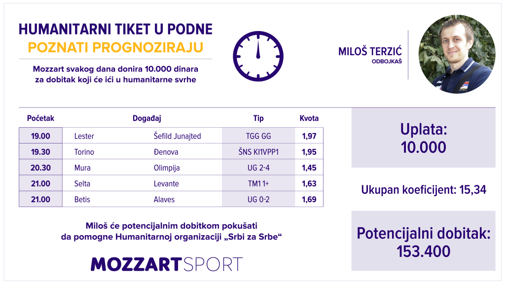 Humanitarni radMozzartHumanitarni tiket u podne – Miloš Terzić za Organizaciju “Srbi za Srbe”Nema komentaraNo tags1.06Kpregleda share on Facebookshare on Twittershare on VKontakteOstavite komentar Ostavite komentar Cancel replyCommentName Email Save my name, email, and website in this browser for the next time I comment. PET NA PET – MILOŠ TERZIĆ: Na zalasku sam igračke karijere, ali se nadam da ću odigrati još godinu ili dve, iz čistog zadovoljstvaPET NA PET – Peter Vilfan: Navijači Partizana su mi svojevremeno kazali da se “grobar” rađa, a da sam ja postao “grobar”Povezane vestiHumanitarni radPravoslavljeVaskršnja poseta kralja Aleksandra Obrenovića Svetom manastiru HilandaruDjurdjeapril 19, 2026april 19, 202630https://www.instagram.com/p/DXR4OVNjelO/?igsh=eGtqNmtkeHN6d2d1 Васкршња посета краља Александра Обреновића Светом манастиру Хиландару У изразито неповољном историјском тренутку обележеном драстичним смањењем броја српских монаха,...Humanitarni radPravoslavljeMetoh KakovoDjurdjeapril 18, 2026april 18, 2026118https://www.facebook.com/reel/1301614781928264https:// teofil1198.org/doniraj/ https://www.facebook.com/reel/1301614781928264 https://www.hilandar.org/donacije/ https://teofil1198.org/doniraj/ https://teofil1198.org/doniraj/ ...Humanitarni radPravoslavljeTeofil 1198Djurdjeapril 14, 2026124https://www.hilandar.org/donacije/ https://www.hilandar.org/donacije/...Humanitarni radOvakve poruke znaju da budu zamorne i čitaocima i nama koji ih pišemoDjurdjeapril 14, 2026april 14, 202634Ali, druge nam nema, pošto nam ni predaje nema, iako oko nas padaju neke od poslednjih profesionalnih redakcija. Ovakvim pismima...
