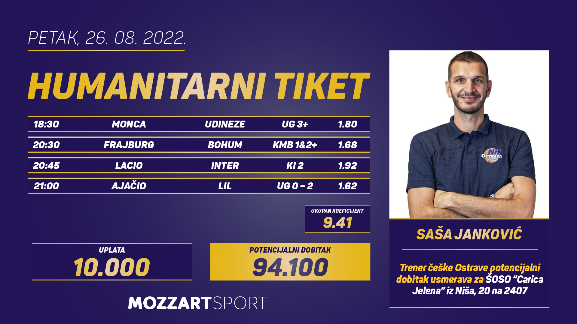 “UG 0 – 2”, zaključuje tipovanje SAŠA JANKOVIĆ. Trener češke Ostrave potencijalni dobitak usmerava za ŠOSO “Carica Jelena” iz Niša, 20 na 2407, Fondacija “Humanost bez granica”.