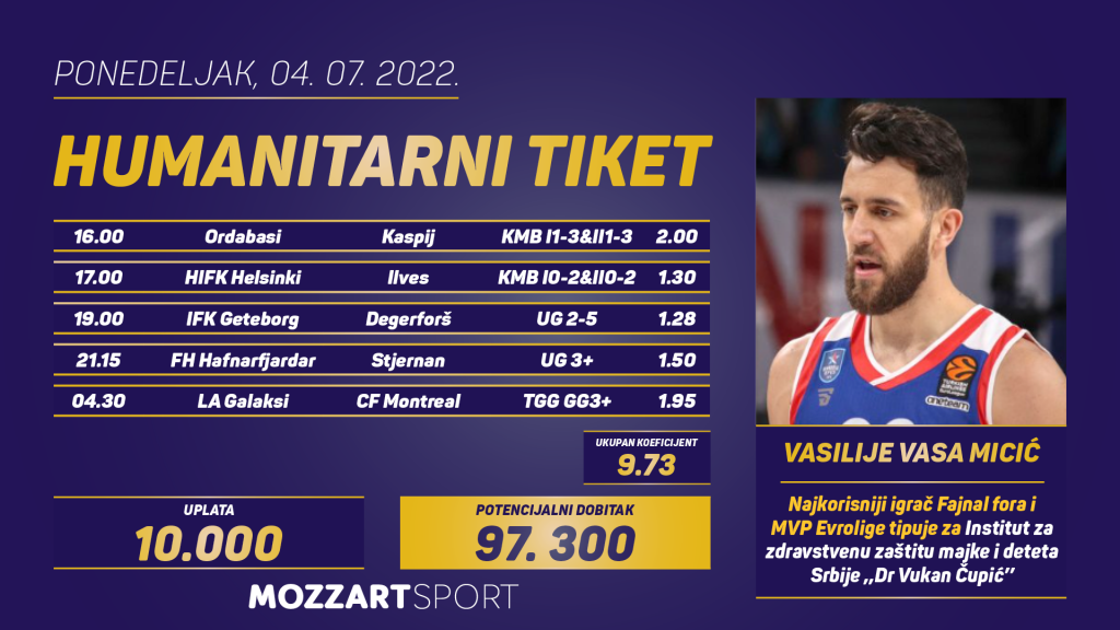 HUMANITARNI TIKET U PODNE: VASILIJE VASA MICIĆ tipuje za Institut za zdravstvenu zaštitu majke i deteta Srbije ,,Dr Vukan Čupić’’