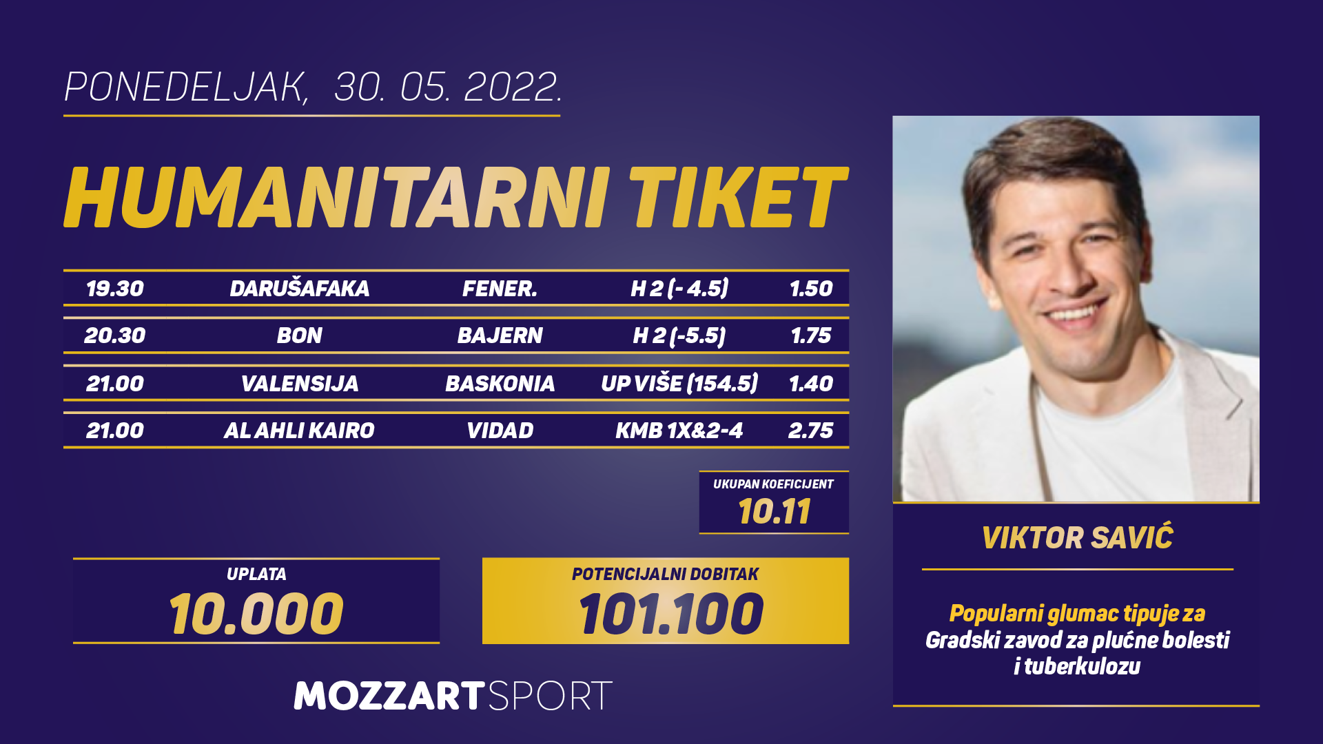 HUMANITARNI TIKET U PODNE: VIKTOR SAVIĆ tipuje za Gradski zavod za plućne bolesti i tuberkulozu