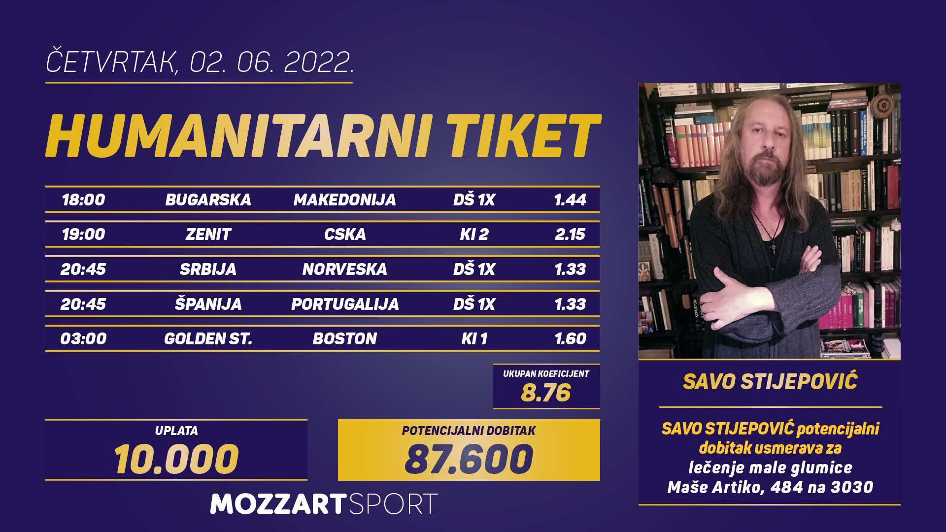 HUMANITARNI TIKET U PODNE:SAVO STIJEPOVIĆ tipuje za za lečenje Maše Artiko, 484 na 3030