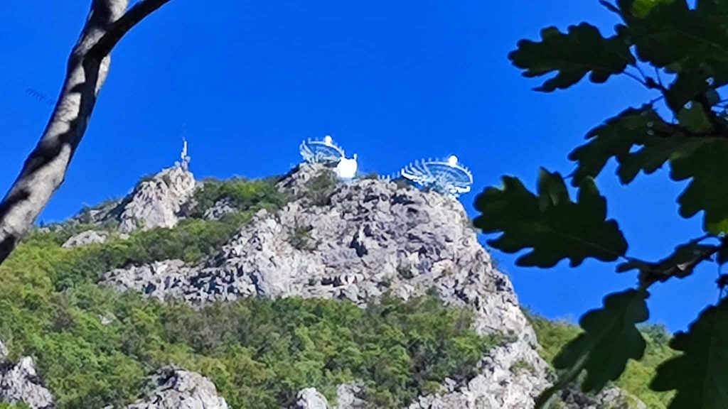Kod table skrećemo, put delimično asfaltiran, pa nije, pa opet jeste…Postavljene mreže, zbog odrona, a na mestima gde nema mreža ima kamenja po putu. Gost primećuje da nisu postavljene odvodne cevi za kišnicu što se odrazilo na put. Stižemo do mesta (livade) jer moramo peške. Seoski put ka vrhu zahteva terensko vozilo. Idemo ka vrhu, postavljene table nam pomažu i konačno stižemo.