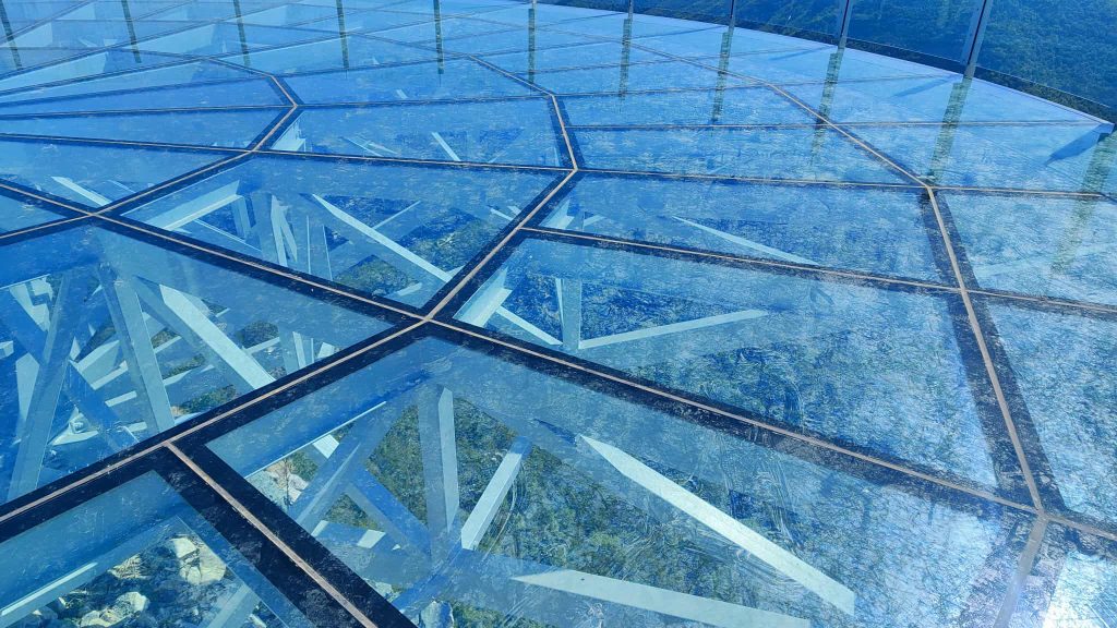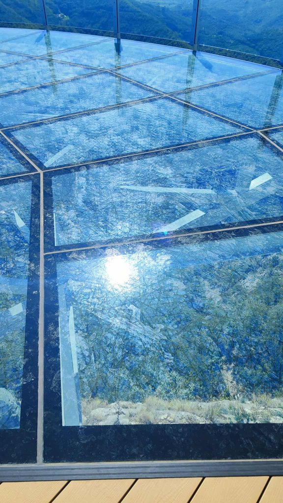 Mesto gde su postavljenja dva vidikovca, u obliku tanjira, ograđeno. Znamo da još nije u funkciji i da nas čuvar, zbog bezbednosti, neće pustiti, ali ne odustajem…Uz to, razmišljam, (pitate se čime, opravdano), toliko puta sam bio, neki ljudi od mene i desetinu puta više, neki Čačani nikad. Da li ćemo sad morati da plaćamo kartu za pogled na meandre Morave koji uvek ostave bez daha? Uz pomoć “veze”, prolazimo kroz kapiju. Idealni vremenski uslovi dozvoljavaju savršen pogled ka Čačku. Gost se malo pribojava, čitao je oprečne stavove oko vidikovca. Ja, pokazujem znakove hrabrosti, ludosti ili je sve bezbedno. Hodam, sedim, fotografišem, pričam, lepo je, pogled kroz stakleni vidikovac, ka provaliji, zadivljujući…