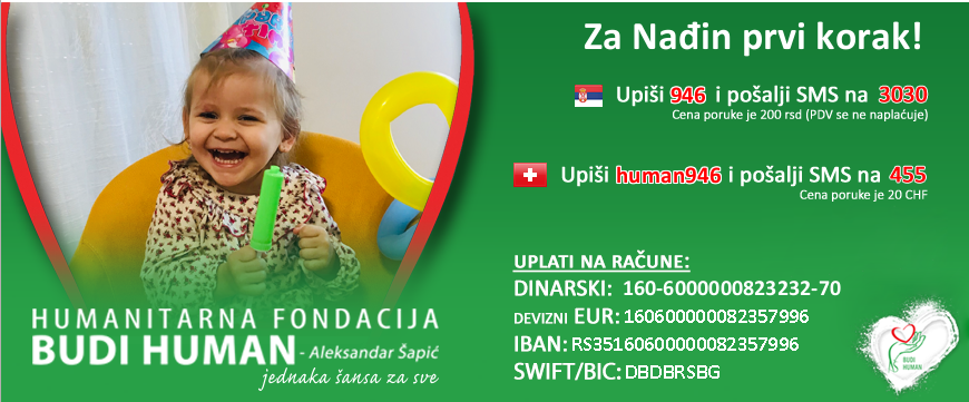Pomozimo Nađi, slanjem SMS poruke 946 na 3030. Uplatom na dinarski račun: 160 – 6000000823232 – 70.