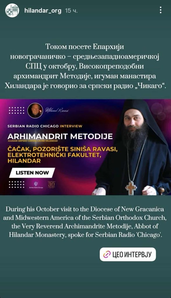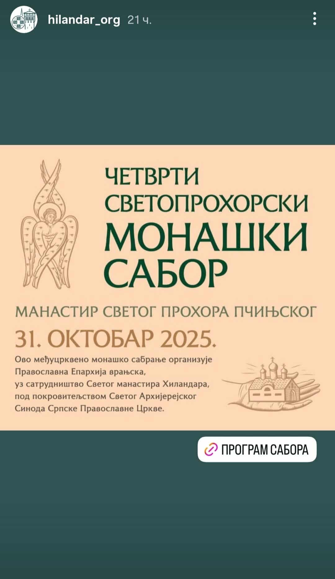 Humanitarni radPravoslavljeManastir Svetog Pohora PčinjskogNema komentaraNo tags173pregleda ДОНАЦИЈЕ Донирај share on Facebookshare on Twittershare on VKontakteOstavite komentar Ostavite komentar Cancel replyCommentName Email Save my name, email, and website in this browser for the next time I comment. “Pet na pet” (IZ NAŠE ARHIVE) Žarko PaspaljPet na pet-Darko Rajaković: Košarkaški uzor mi je bio jedan i neponovljiv Sale NacionalePovezane vestiHumanitarni radPravoslavljeDjurdjeapril 24, 2026127https://www.hilandar.org/donacije/ https://www.instagram.com/reel/DXCnx5rDlJe/?igsh=MWNhNnd5cXdsczJyNA== https://teofil1198.org/doniraj/...Humanitarni radPravoslavlje„U opasnosti smo!” – Nikolina (8) i Lara (6) strepe od VUKOVA i da im KLIZIŠTE ne odnese kuću! (video)Djurdjeapril 21, 2026185„Vuk nam je jednom došao u dvorište i napao jagnje. Mnogo sam se uplašila i od tada ne smemo da...Humanitarni radPravoslavljeHilandarsko selo – Teofil 1198Djurdjeapril 20, 202651https://www.instagram.com/reels/DNWGkMItkC1/ https://teofil1198.org/doniraj/ https://www.instagram.com/reels/DNWGkMItkC1/ https://www.hilandar.org/donacije/ ...Humanitarni radPravoslavljeVaskršnja poseta kralja Aleksandra Obrenovića Svetom manastiru HilandaruDjurdjeapril 19, 2026april 19, 202664https://www.instagram.com/p/DXR4OVNjelO/?igsh=eGtqNmtkeHN6d2d1 Васкршња посета краља Александра Обреновића Светом манастиру Хиландару У изразито неповољном историјском тренутку обележеном драстичним смањењем броја српских монаха,...