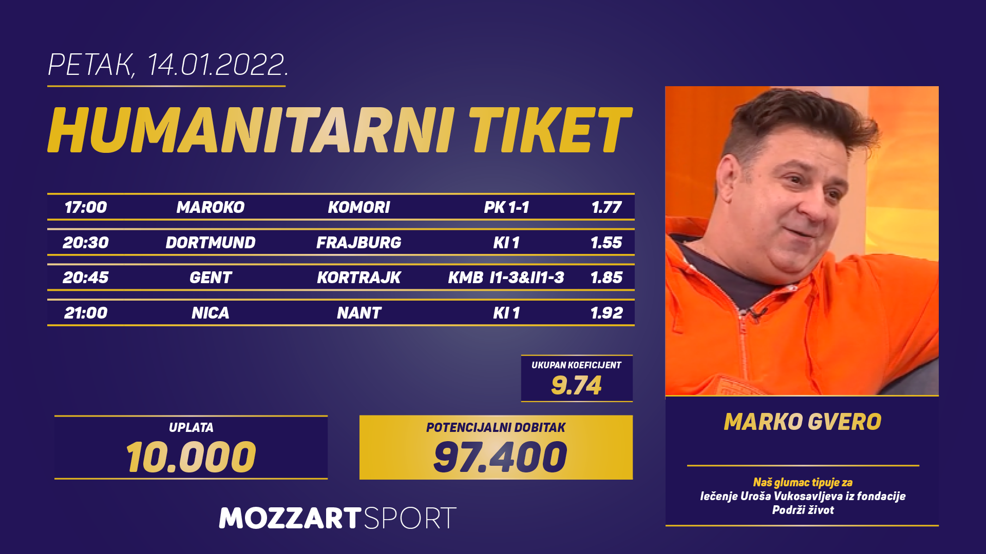 Sastavio je Gvero humanitarni tiket sa dobitkom od 97.400 dinara! Ciljao je iz jedan u jedan na MAROKO – KOMORI, KMB I1-3&II1-3 na GENT – KORTRAJK. Potom, na utakmici DORTMUND – FRAJBURG pogodio je KI 1, a konačnu prolaznost tiketa zapečatio je “Kemal Halimić Kemica” jedinicom na meču NICA – NANT.