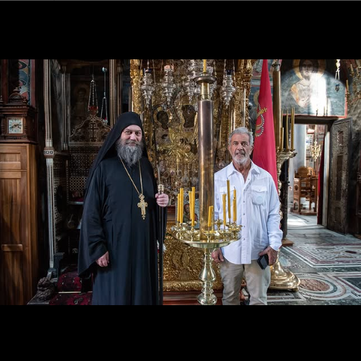 Visokoprepodobni arhimandrit Metodije i Mel Gibson pored ikone Presvete Bogorodice Trojeručice u Hilandaru.