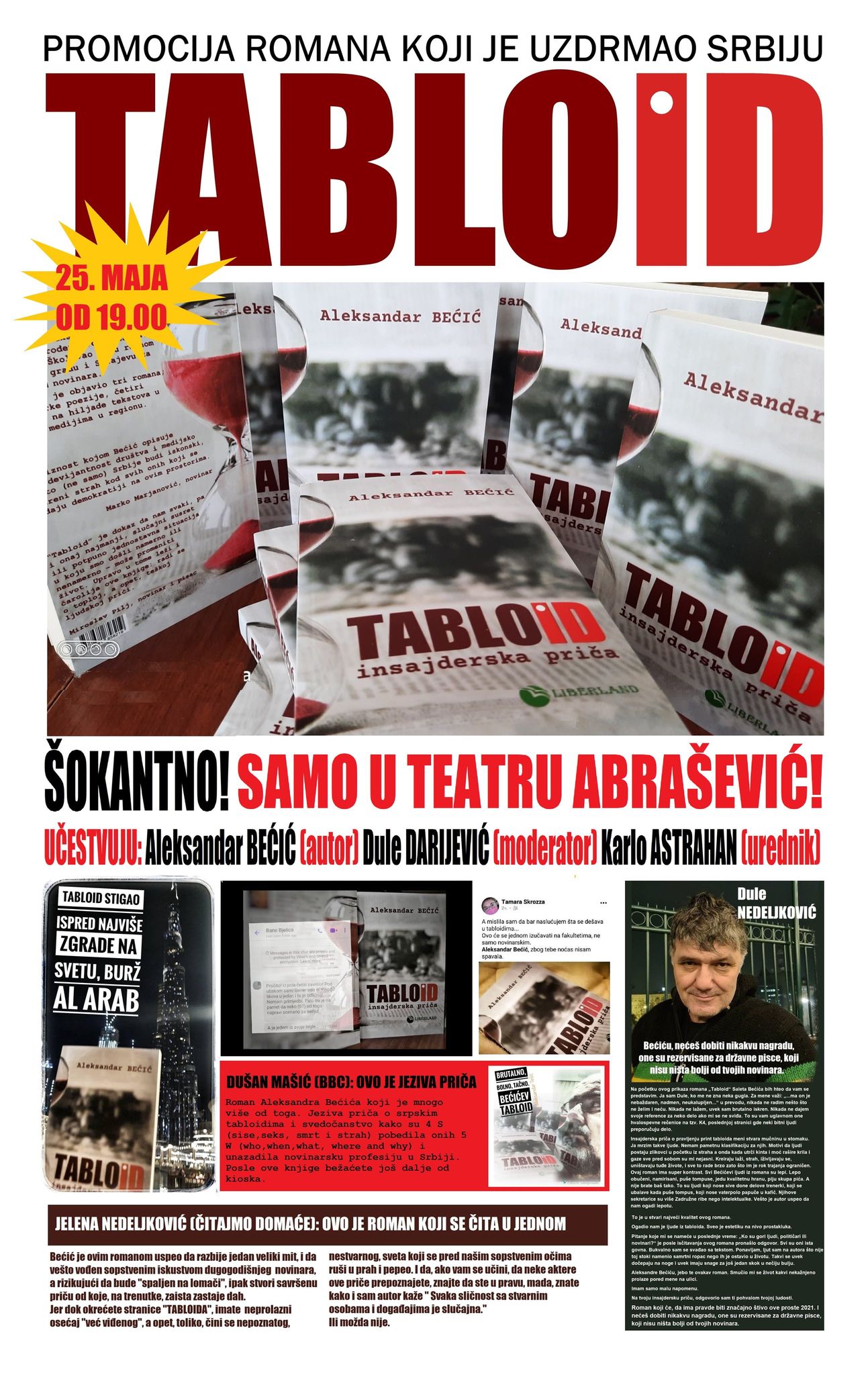 Prvo izdanje romana Tabloid gotovo da je rasprodato samo preko društvenih mreža, a autorovo gostovanje u njegovom rodnom gradu biće prilika da sa njim podelite nova iskustva, čujete šta je ono čime se sada bavi i saznate više o tome da li će „Tabloid“ uskoro dobiti svoju filmsku odnosno televizijsku verziju.