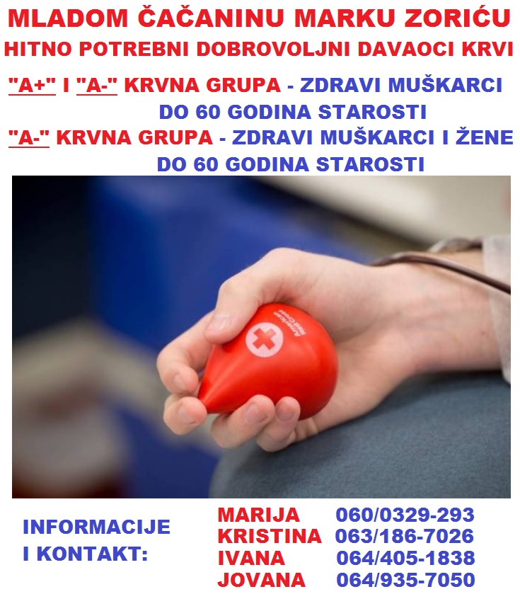 Свесни смо свих тешкоћа тренутка у коме се налазимо, Kовид пандемије која је у току, али нажалост Марко се налази у таквом стању да не може да чека. Молимо све који испуњавају ове услове за давање крви да се ради добијања прецизних упутстава и информација јаве на следеће контакт телефоне: 0600329293 (Марија), 0631867026 (Kристина), 0644051838 (Ивана), 0649357050 (Јована).