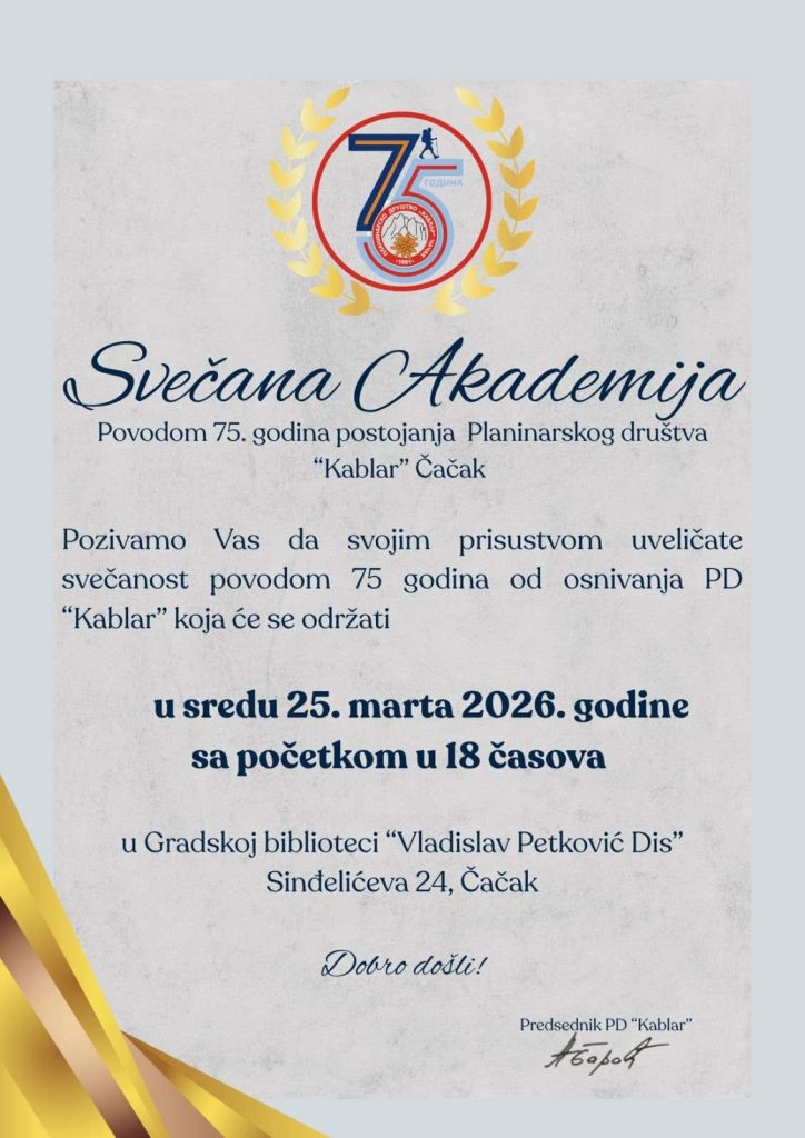 UncategorizedPD KABLAR obeležava 75 rođendanNema komentaraNo tags142pregleda share on Facebookshare on Twittershare on VKontakteOstavite komentar Ostavite komentar Cancel replyCommentName Email Save my name, email, and website in this browser for the next time I comment. „Otkrijte svetinju kroz objektiv hilandarskog monaha”Borac u egalu tri četvrtine, ali pobeda ipak ide u ruke MegePovezane vestiUncategorizedFOTO: Sava Gucunski (košarka)Djurdjeapril 7, 2026april 7, 2026122UncategorizedNaš zavičajni pesnik Branislav Brana Petrović rođen je na današnji dan pre 89 godinaDjurdjeapril 7, 2026april 7, 202641Rođen je na Blagovesti 7. aprila 1937. godine, u selu Bjeluši kod Arilja. Iako je rođen u okolini Arilja detinjstvo...UncategorizedDani Japana u Čačku (Foto)Djurdjeapril 5, 2026140UncategorizedPAVILJON Bosna i Hercegovina, Hrvatska, Srbija, 2025, 100 min, crna komedijaDjurdjemart 28, 2026136„Paviljon“ je crna komedija koja na provokativan i duhovit način govori o generaciji najstarijih, koja u savremenom društvenom trenutku odlučuje...