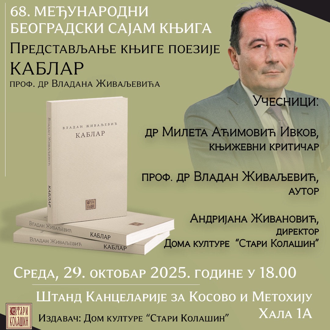 U sredu 29. oktobra 2025. godine od 18 časova na 68. Međunarodnom sajmu Beogradu, na štandu Kancelarije za Kosovo i Metohiju u Hali 1A biće održano predstavljanje knjige “Kablar”. Autor knjige je naš zemljak Čačanin profesor doktor Vladan Živaljević. U promociji će učestvovati dr Mileta Aćimović Isakov, književni kritičar, Andrija Živanović, direktor Doma Kulture “Kolašin”, kao i sam autor profesor dr Vladan Živaljević.