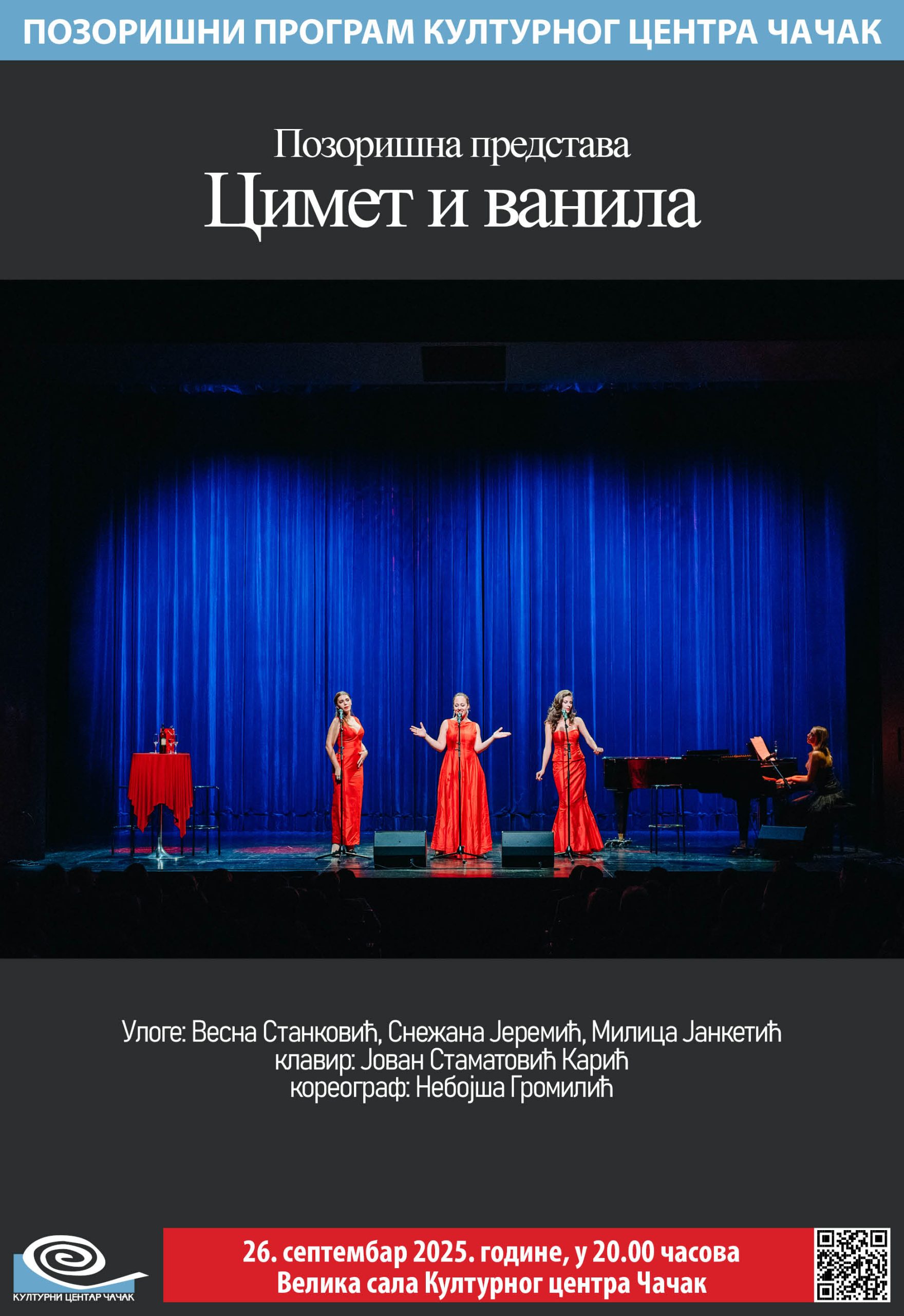 ,,Cimet i vanila"” je veoma atraktivna i intrigantna savremena komedija o susretu tri žene i tri pogleda na svet. Večita tema koja njih spaja su muškarci, muško- ženski svet, i u ovom kontekstu popularne pesme šezdesetih, sedamdesetih i osamdesetih godina. Kroz prizmu muzike i pesme