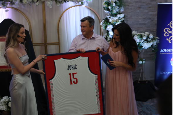 Humanitarna aukcija bila je jedan od najupečatljivijih momenata večeri. Prisutni su mogli da licitiraju za četiri dragocena i simbolična predmeta, među kojima su se našli prepisi stare i značajne 87. stranice Miroslavljevog jevanđelja i potpisani dres Nikole Jokića, koji su zajedno doprineli prikupljanju ukupno 8.900 evra.