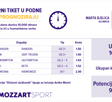 Humanitarni radMozzartGlumica Marta Bjelica je 222. dobitnica u Humanitarnom tiketu u podne kompanije MozzartDjurdjenovembar 24, 2020novembar 24, 20201.39KUčesnica Humanitarnog tiketa u podne, glumica Marta Bjelica, juče je sastavila plemeniti listić i pogodila tri plus na utakmice iz...