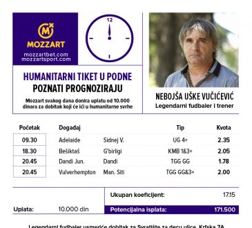 Humanitarni radMozzartSportNebojša Uške Vučićević MOZZARTOV je 195. dobitnik u Humanitarnom tiketu u podneDjurdjedecembar 28, 20191.38KPlemeniti tiket kompanije MOZZART ima još jednog dobitnika. Nakon bivšeg košarkaša Crvene zvezde Pere Antića (149.400, Srbi za Srbe), portparola...