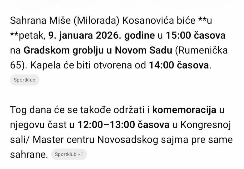 DruštvoUpokojio se Miša Kosanović, sahrana je u petak 09.01. 2026.Nema komentaraNo tags223pregleda share on Facebookshare on Twittershare on VKontakteOstavite komentar Ostavite komentar Cancel replyCommentName Email Save my name, email, and website in this browser for the next time I comment. FOTO – KK Borac Mozzart ( Sava Gucunski )Srećno Badnje jutro, dan i veče!Povezane vestiDruštvoMikrobilje iz porodičnog stana: Kako su Milunovići od prve saksije napravili sopstveni biznisDjurdjeapril 14, 2026101Mikrobilje, odnosno druga faza rasta biljke, za koju se smatra da tada ima i do 40 puta više nutrijenata nego...DruštvoVratile se rode…(FOTO)Djurdjeapril 10, 2026april 10, 2026118Foto: Kablarnet.rs (Đ.M.)...DruštvoGrčka često nije prvi izbor: Gde putuju penzioneri i šta najčešće tražeDjurdjeapril 6, 202683Putovanja u kasnijoj životnoj dobi više nisu retkost. Zahvaljujući višku slobodnog vremena, generacija 65+ danas čini značajan deo tržišta koji...DruštvoDragi članovi, prijatelji i poštovaoci Udruženja Čačana u Beogradu,Djurdjemart 12, 2026251Danas obeležavamo jubilej od 170 godina od rođenja jednog od najvećih srpskih vojskovođa, Vojvode Stepe Stepanovića. Rođen 12. marta 1856....