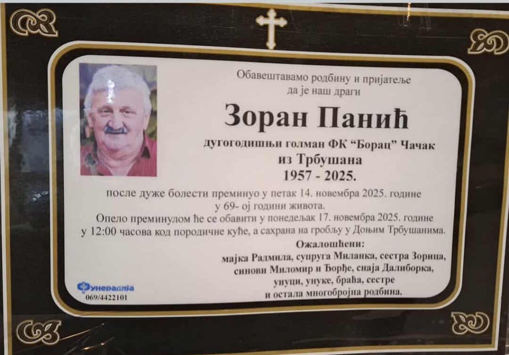 Fudbalski klub “Borac 1926” , obaveštava javnost i medije da će se komemoracija povodom smrti našeg bivšeg fudbalera Zorana Panića , održati dana 16.11.2025. na stadionu u Čačku , sa početkom u 12.00 h.