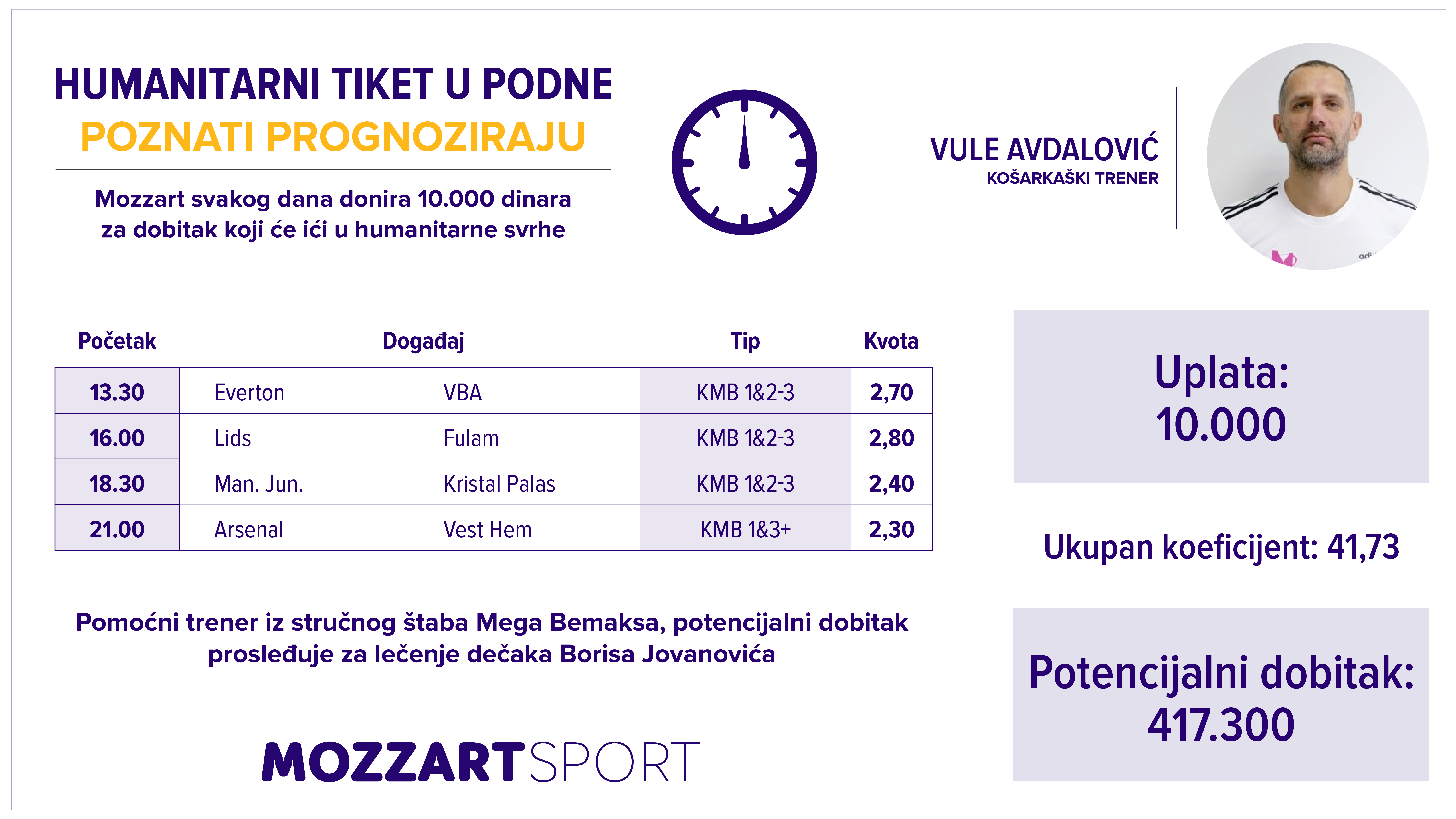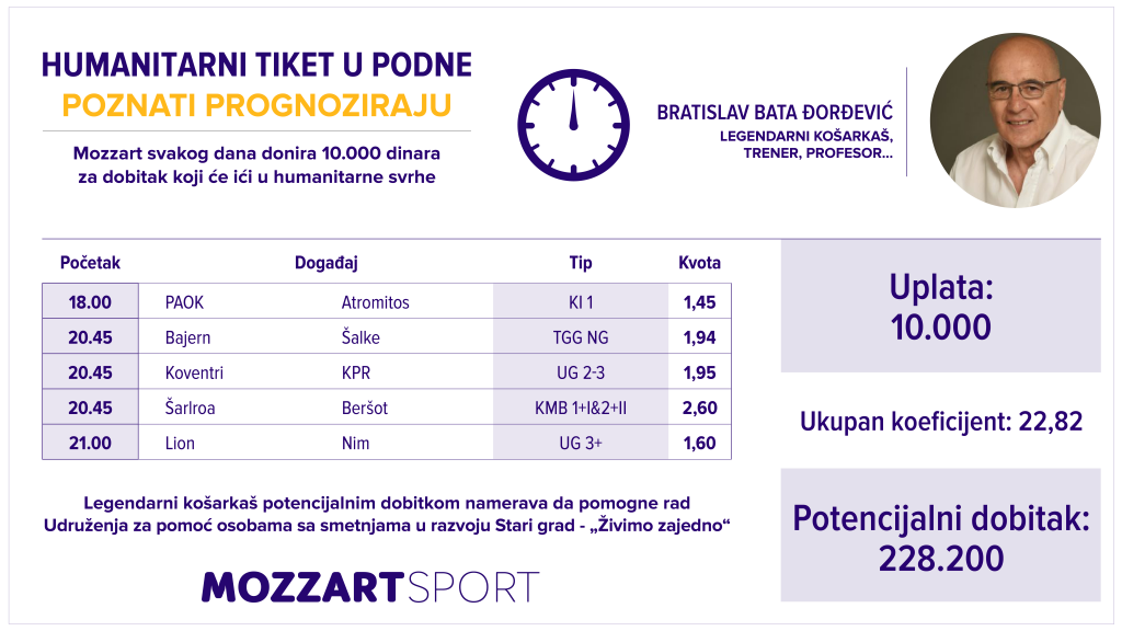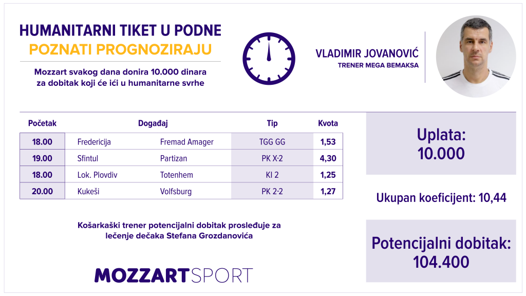 Podsećamo na MOZZART – ove plemenite kladioce u “Humanitarnom tiketu u podne” sa iznosima od preko 100.000, 00 dinara.To su: Andrea Trinkijeri, Ivan Jović, Strahinja Gavrilović, Vanja Bulić, Momčilo Bajagić, Uroš Tripković, Radomir Antić, Vojin Ćetković, Vojkan Borisavljević, Zdravko Čolić, Jovan Maljoković, Nenad Stojmenović, Sara Sakradžija, Milan Caci Mihailović, Miloš Teodosić, Danica Ristovski, Dimitrije Ilić, Marko Tejić, Srđan Vasiljević, Milica Mandić, Branislav Trifunović, Predrag Miljuš, Dragana Cvijić, Boris Režak, Duško Pijetlović, Prof. Branko Đurović, Duško Nikolić, Zoran Vujičić, Milan Pavkov, Ana Joković, Ivica Šurjak, Emir Kusturica, Aleksandar Srećković, Nikola Mišković, Dejan Mišković, Zoran Višić, Ljubiša Stojanović, Milan Mačvan, Nenad Brnović, Ivan Paunić, Dejan Ristić, Milena Pavlović Čučilović, Antun Novaković, Pero Antić, Ivan Ivković, Brajs Džouns, Nebojša Vučićević, Darko Tešović, Aleksandar Simetrija Đorđević, Zoran Njeguš, Milan Zelen, Predrag Jeremić, Igor Gluščević, Slavoljub Krnjinac, Mirko Milikić, Mladen Krstajić i Vanja Savić.