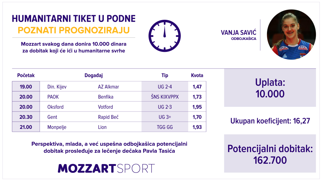 Vanja Savić najbolji korektor Evropskog prvenstva za juniorke je 213. dobitnik u MOZZARTOVOM Humanitarnom tiketu u podne