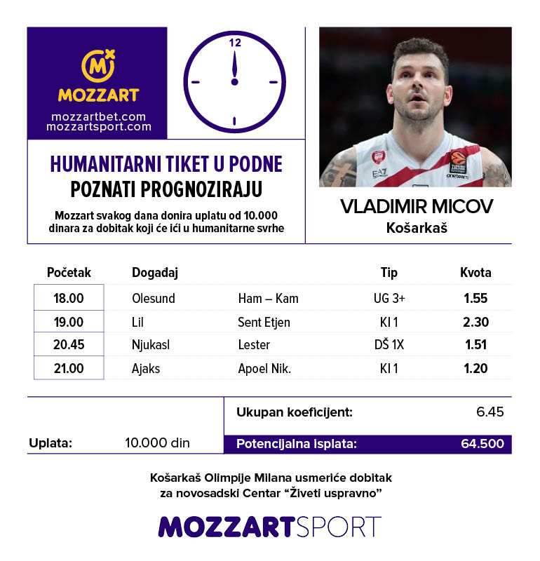 MOZZARTOV Humanitarni tiket u podne od sinoć ima 183. plemenitog dobitnika. Reč je o košarkašu Olimpije Milana Vladimiru Micovu koji je ispisao dobrotvorni listić za sjajnih 64.500, 00 dinara. Dobitak je namenio za novosadski centar “Živeti uspravno” koji uz pomoć najčešće mladih asistenata pomažu osobama sa invaliditetom, a pošto baš ovih dana prikupljaju novac za prinadležnosti angažovanim saradnicima mislimo da će ih ova MOZZARTOVA donacija posebno obradovati.